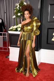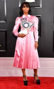 Vestido largo de alta costura en tonos verdes, combinando diferentes tejidos y definiendo muy bien su figura. Fue una de las protagonistas de la gala, ganó 5 grammys y estuvo fabulosa para recibirlos. No solo brilló por esto, sino por sus elogios a Beyoncé.